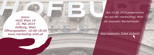 Nur noch knapp 60 Tage und die marke[ding] Wien– Österreichs größte Werbemittelmesse - zeigt am 15. Mai 2014 in der Wiener Hofburg wieder ihr umfangreiches Spektrum an haptischen Werbeideen. | |