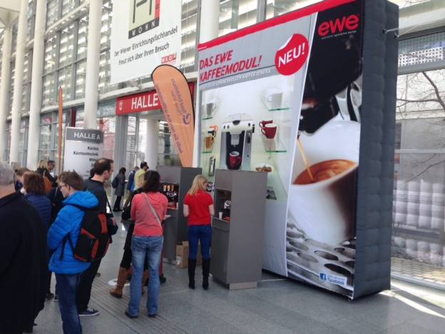 Dieser 4,5m Meter hohe und 4 Meter breite Quader für EWE zieht alle Blicke auf sich. So gesehen auf der Wohnen & Interieur Messe in Wien. Mit wenigen Handgriffen steht die Message am Quader bei allen Arten von Veranstaltungen im Mittelpunkt des Geschehens. Dieser Eyecatcher ist problemlos auf- und abzubauen und kann optional auch beleuchtet werden: Damit Sie bei vielen für Sie wichtigen Events Ihre Botschaft ins rechte Licht rücken können!