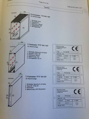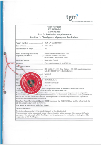 In einem 42 seitigen Prüfbericht bestätigt die staatliche Versuchsanstalt, dass die LED – Leuchtkästen der nach der europäischen CE Richtlinie IEC 60598-2-1 gebaut und erfolgreich zertifiziert sind und dass sämtliche in diesen Baureihen verwendeten Komponenten sowie die Installation und Verarbeitung diesen Richtlinien entsprechen.