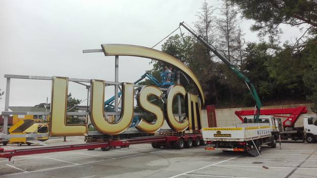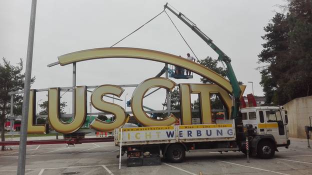 Lichtwerbung Maierhofer liefert und montiert neben den drei Fassaden- und Dachleuchtschriften auch ein 2 Meter hohes, ebenfalls in Gold gefasstes Leuchtband mit über 220 Meter Länge.