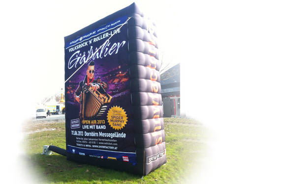 Dieser fünf Meter hohe und vier Meter breite Quader zieht alle Blicke auf sich. Mit wenigen Handgriffen steht die Message bei Events wie Konzerten, Sport- und Cityfesten im Mittelpunkt des Geschehens. Durch die beidseitig wechselbaren Transparente an der Vorder- und Rückseite kann man immer topaktuell und rasch das Neueste kommunizieren.